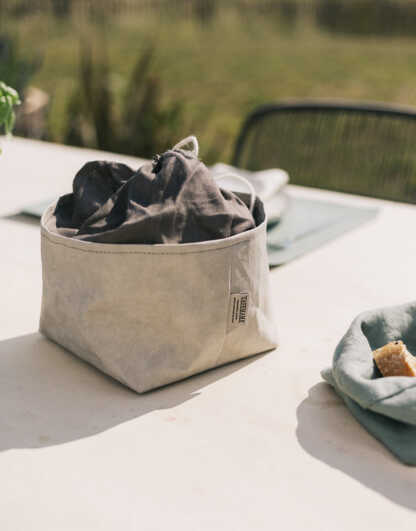 Paper Bag lavable con cobertor de lino para mantener panes y galletas seguros y calientes. Elija dentro de la variedad de colores y combinaciones con lino orgánico. Combínalo con el Calentador de Panes de Terracota.